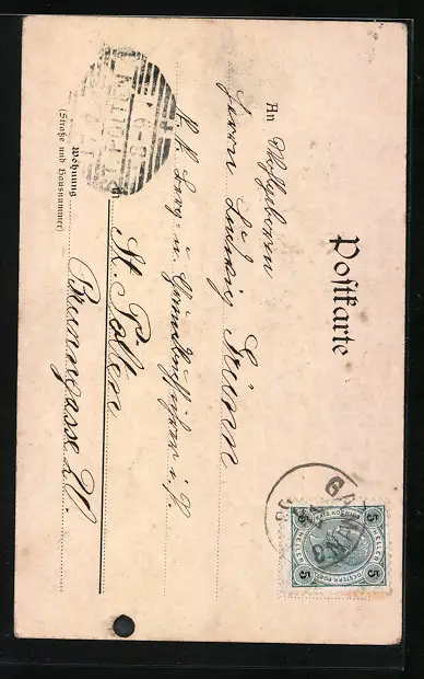 Personenbezogene Daten auf der Rückseite der Karte wurden durch blauen Textmarker unkenntlich gemacht. Die blauen Stellen sind auf die Vorderseite durchgeweicht und wirken sich negativ auf das Postkartenfoto aus