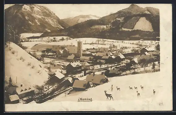 AK Gaming, Ortsansicht mit Bergspitzen im Winter