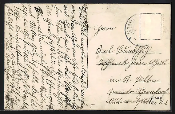 Personenbezogene Daten auf der Rückseite der Karte wurden durch blauen Textmarker unkenntlich gemacht. Die blauen Stellen sind auf die Vorderseite durchgeweicht und wirken sich negativ auf das Postkartenfoto aus