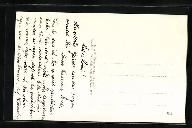 Personenbezogene Daten auf der Rückseite der Karte wurden durch blauen Textmarker unkenntlich gemacht. Die blauen Stellen sind auf die Vorderseite durchgeweicht und wirken sich negativ auf das Postkartenfoto aus