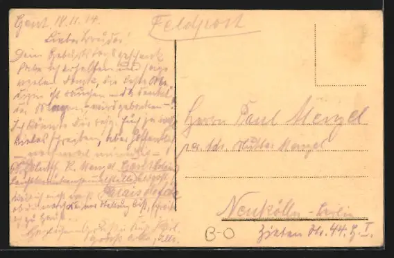 Personenbezogene Daten auf der Rückseite der Karte wurden durch blauen Textmarker unkenntlich gemacht. Die blauen Stellen sind auf die Vorderseite durchgeweicht und wirken sich negativ auf das Postkartenfoto aus