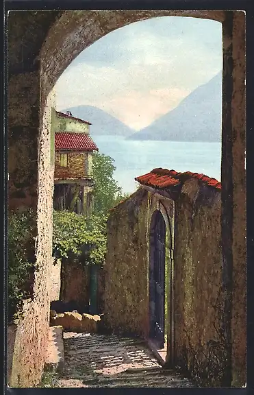 AK Gandria, /Lago di Lugano, Gassenpartie mit Tor und Seeblick