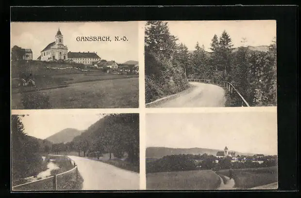 AK Gansbach, Strassenpartie mit Bäumen, Kirche