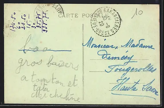 Personenbezogene Daten auf der Rückseite der Karte wurden durch blauen Textmarker unkenntlich gemacht. Die blauen Stellen sind auf die Vorderseite durchgeweicht und wirken sich negativ auf das Postkartenfoto aus