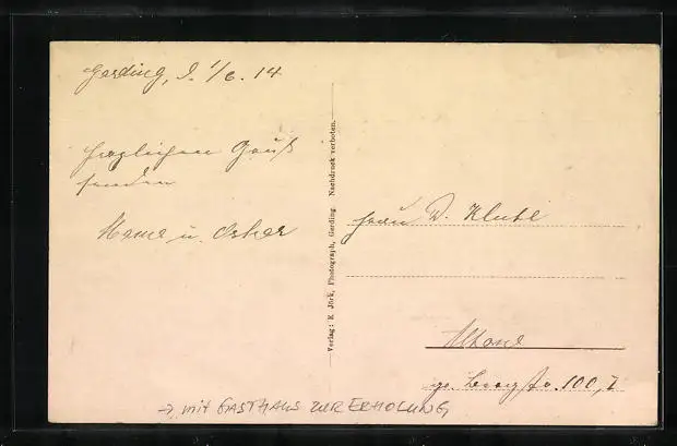Personenbezogene Daten auf der Rückseite der Karte wurden durch blauen Textmarker unkenntlich gemacht. Die blauen Stellen sind auf die Vorderseite durchgeweicht und wirken sich negativ auf das Postkartenfoto aus