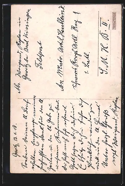 Personenbezogene Daten auf der Rückseite der Karte wurden durch blauen Textmarker unkenntlich gemacht. Die blauen Stellen sind auf die Vorderseite durchgeweicht und wirken sich negativ auf das Postkartenfoto aus