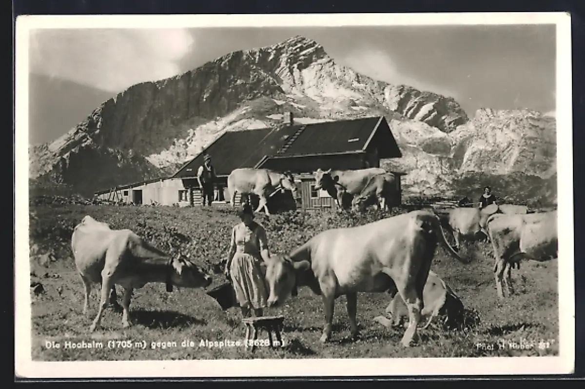 AK Garmisch, Kühe bei Hochalm, Blick gegen die Alpspitze