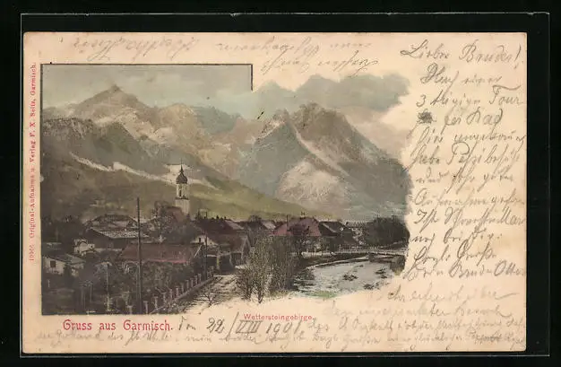 AK Garmisch, Teilansicht mit Kirche und Wettersteingebirge