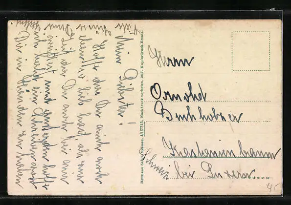 Personenbezogene Daten auf der Rückseite der Karte wurden durch blauen Textmarker unkenntlich gemacht. Die blauen Stellen sind auf die Vorderseite durchgeweicht und wirken sich negativ auf das Postkartenfoto aus