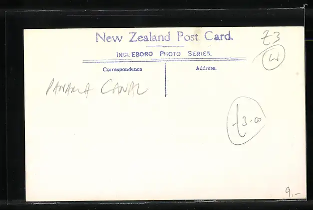 Personenbezogene Daten auf der Rückseite der Karte wurden durch blauen Textmarker unkenntlich gemacht. Die blauen Stellen sind auf die Vorderseite durchgeweicht und wirken sich negativ auf das Postkartenfoto aus