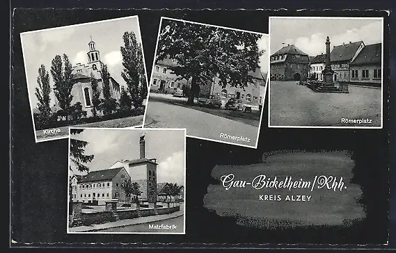 AK Gau-Bickelheim /Rhh., Kirche, Römerplatz, Malzfabrik