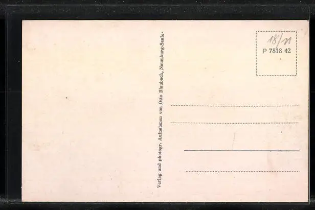 Personenbezogene Daten auf der Rückseite der Karte wurden durch blauen Textmarker unkenntlich gemacht. Die blauen Stellen sind auf die Vorderseite durchgeweicht und wirken sich negativ auf das Postkartenfoto aus