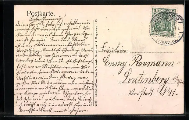Personenbezogene Daten auf der Rückseite der Karte wurden durch blauen Textmarker unkenntlich gemacht. Die blauen Stellen sind auf die Vorderseite durchgeweicht und wirken sich negativ auf das Postkartenfoto aus