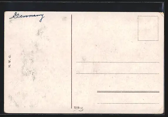 Personenbezogene Daten auf der Rückseite der Karte wurden durch blauen Textmarker unkenntlich gemacht. Die blauen Stellen sind auf die Vorderseite durchgeweicht und wirken sich negativ auf das Postkartenfoto aus