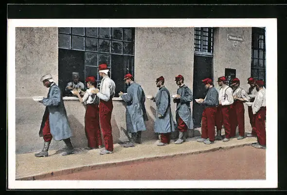 AK Gefangene Franzosen beim Menagieren, Kriegsgefangene