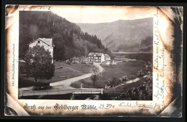 AK Gehlberger Mühle, Ortsansicht aus der Vogelschau, mit Brücke