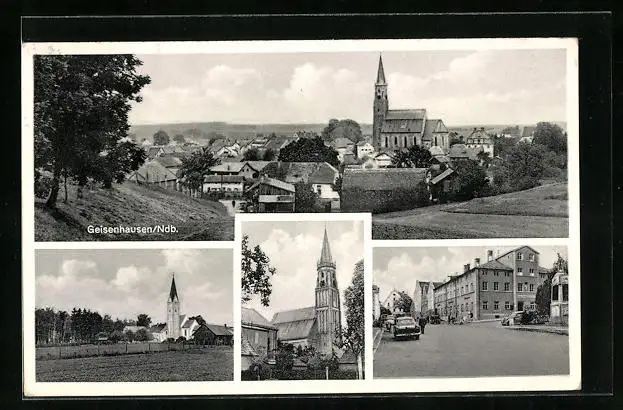 AK Geisenhausen /Ndb., Strassenpartie mit Gebäudeansicht, Kirche, Ortspartie