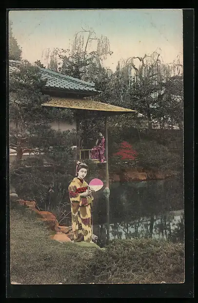 AK Geishas in einem Garten mit Gebäude und Teich