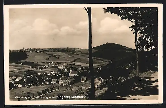 AK Geising, Totalansicht mit Altenberg und Geisingberg im Erzgebirge