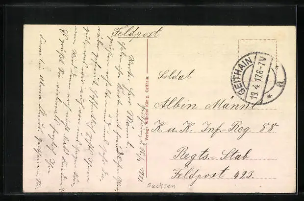 gelaufen 1917 als Feldpost, Oberflächenschaden links unten, guter Zustand