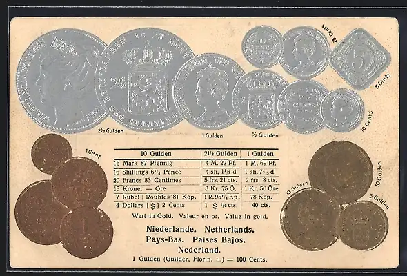 AK Geld, Niederlande, Übersicht Münzen der Landeswährung Gulden