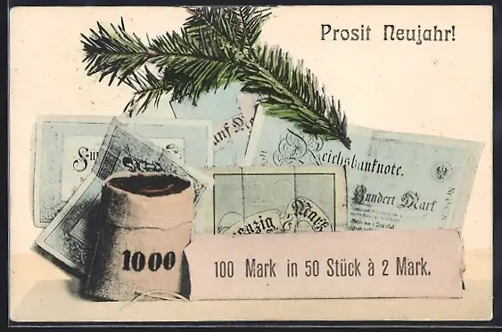 AK Geldbeutel und Geldscheine, Neujahrskarte
