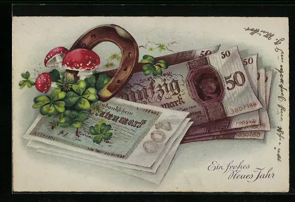 AK Geldscheine mit Glücksklee und Hufeisen, Neujahrsgruss