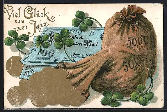 AK Geldscheine und Säcke mit Münzen, Neujahrsgruss