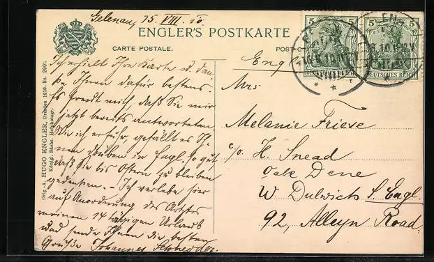 alte Ansichtskarte, gelaufen 1910, guter Zustand