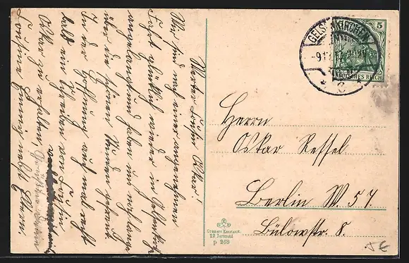 Personenbezogene Daten auf der Rückseite der Karte wurden durch blauen Textmarker unkenntlich gemacht. Die blauen Stellen sind auf die Vorderseite durchgeweicht und wirken sich negativ auf das Postkartenfoto aus