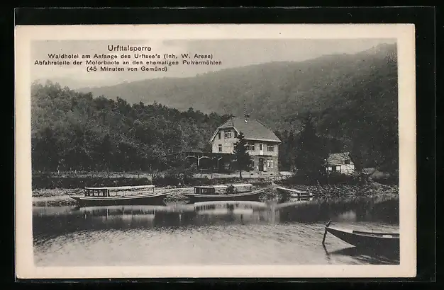 AK Gemünd / Eifel, Waldhotel mit Booten am Fluss