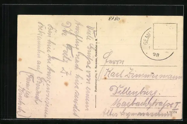 Personenbezogene Daten auf der Rückseite der Karte wurden durch blauen Textmarker unkenntlich gemacht. Die blauen Stellen sind auf die Vorderseite durchgeweicht und wirken sich negativ auf das Postkartenfoto aus