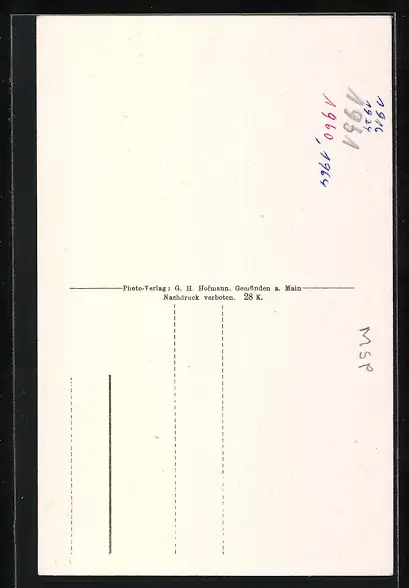 Personenbezogene Daten auf der Rückseite der Karte wurden durch blauen Textmarker unkenntlich gemacht. Die blauen Stellen sind auf die Vorderseite durchgeweicht und wirken sich negativ auf das Postkartenfoto aus