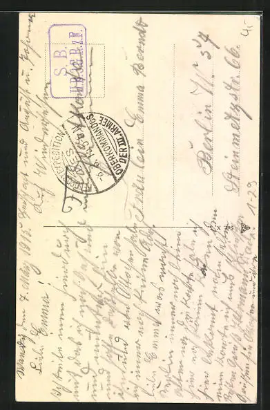 Personenbezogene Daten auf der Rückseite der Karte wurden durch blauen Textmarker unkenntlich gemacht. Die blauen Stellen sind auf die Vorderseite durchgeweicht und wirken sich negativ auf das Postkartenfoto aus