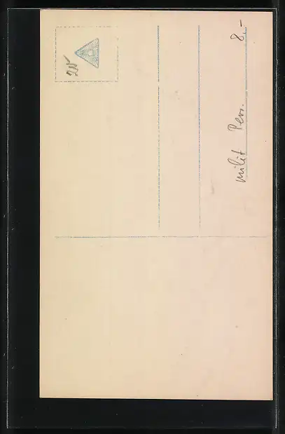 Personenbezogene Daten auf der Rückseite der Karte wurden durch blauen Textmarker unkenntlich gemacht. Die blauen Stellen sind auf die Vorderseite durchgeweicht und wirken sich negativ auf das Postkartenfoto aus