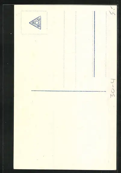 Personenbezogene Daten auf der Rückseite der Karte wurden durch blauen Textmarker unkenntlich gemacht. Die blauen Stellen sind auf die Vorderseite durchgeweicht und wirken sich negativ auf das Postkartenfoto aus