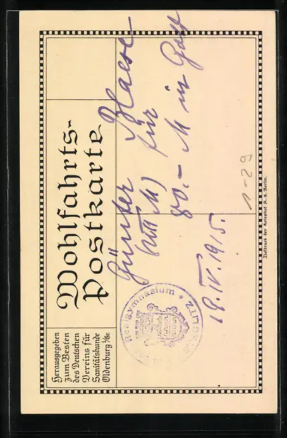 Personenbezogene Daten auf der Rückseite der Karte wurden durch blauen Textmarker unkenntlich gemacht. Die blauen Stellen sind auf die Vorderseite durchgeweicht und wirken sich negativ auf das Postkartenfoto aus
