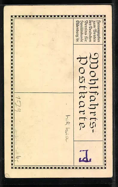 Personenbezogene Daten auf der Rückseite der Karte wurden durch blauen Textmarker unkenntlich gemacht. Die blauen Stellen sind auf die Vorderseite durchgeweicht und wirken sich negativ auf das Postkartenfoto aus