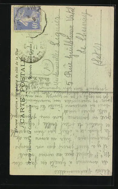 Personenbezogene Daten auf der Rückseite der Karte wurden durch blauen Textmarker unkenntlich gemacht. Die blauen Stellen sind auf die Vorderseite durchgeweicht und wirken sich negativ auf das Postkartenfoto aus