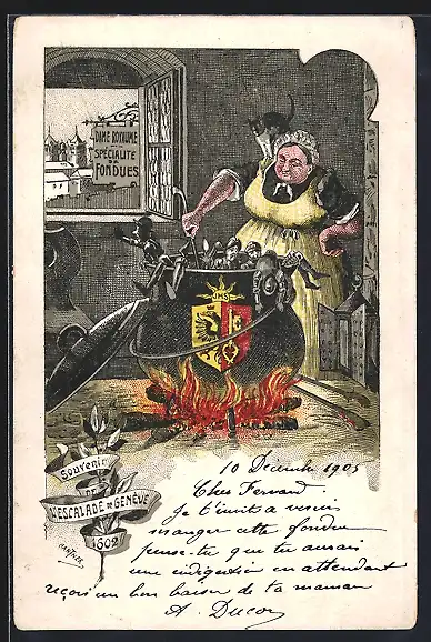 AK Genève, Alte Frau kocht Männer in Kessel mit Wappen