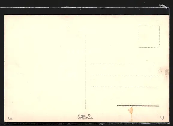 Personenbezogene Daten auf der Rückseite der Karte wurden durch blauen Textmarker unkenntlich gemacht. Die blauen Stellen sind auf die Vorderseite durchgeweicht und wirken sich negativ auf das Postkartenfoto aus