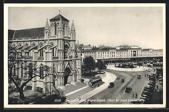 AK Genève, Eglise Notre-Dame, Place et Gare Cornavin, Bahnhof