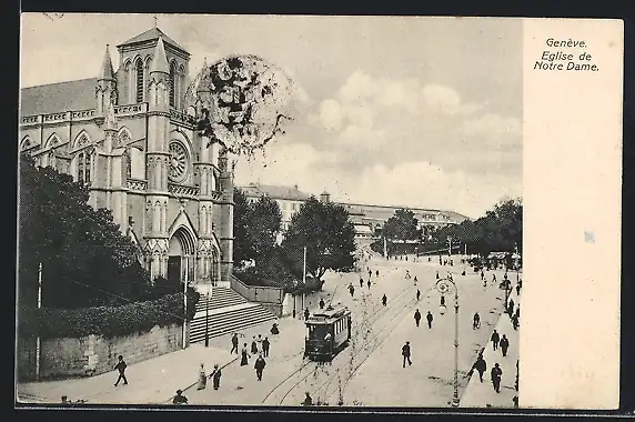 AK Genève, Eglise de Notre Dame, Strassenbahn