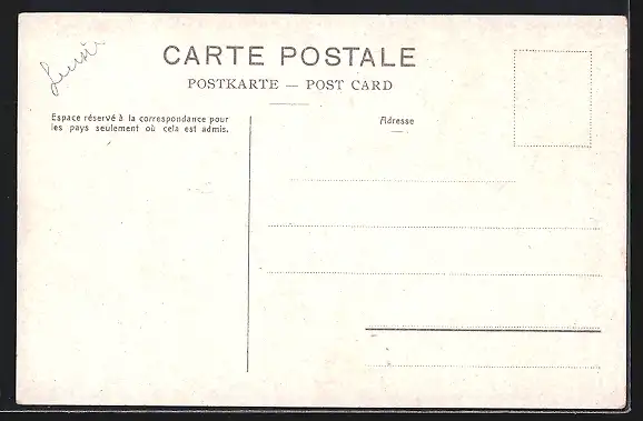 Personenbezogene Daten auf der Rückseite der Karte wurden durch blauen Textmarker unkenntlich gemacht. Die blauen Stellen sind auf die Vorderseite durchgeweicht und wirken sich negativ auf das Postkartenfoto aus