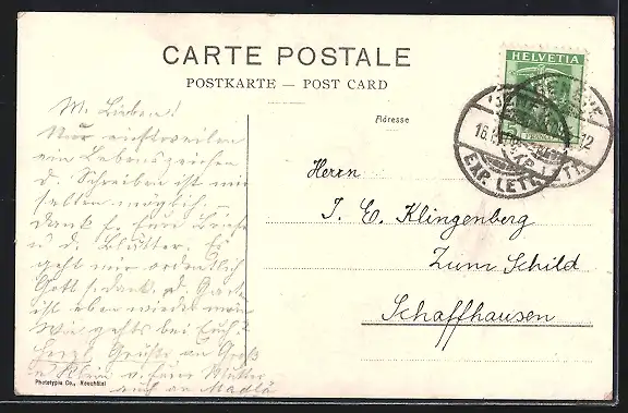 Personenbezogene Daten auf der Rückseite der Karte wurden durch blauen Textmarker unkenntlich gemacht. Die blauen Stellen sind auf die Vorderseite durchgeweicht und wirken sich negativ auf das Postkartenfoto aus