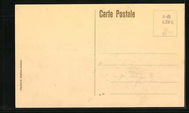 Personenbezogene Daten auf der Rückseite der Karte wurden durch blauen Textmarker unkenntlich gemacht. Die blauen Stellen sind auf die Vorderseite durchgeweicht und wirken sich negativ auf das Postkartenfoto aus