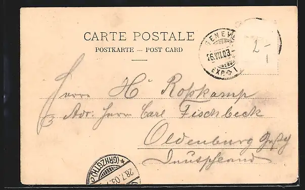 alte Ansichtskarte, gelaufen 1903, Briefmarke entfernt, rückseitig Oberflächenschaden, guter Zustand