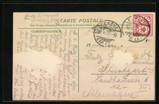 gelaufen 1907, rückseitig Oberflächenschaden, guter Zustand