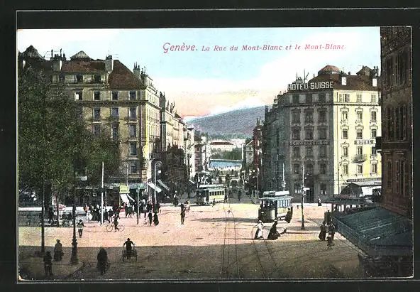 AK Genève, La Rue du Mont-Blanc, et le Mont-Blanc, Strassenbahn