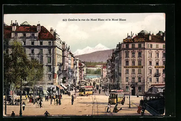 AK Genève, La rue du Mont Blanc et le Mont Blanc, Strassenbahn